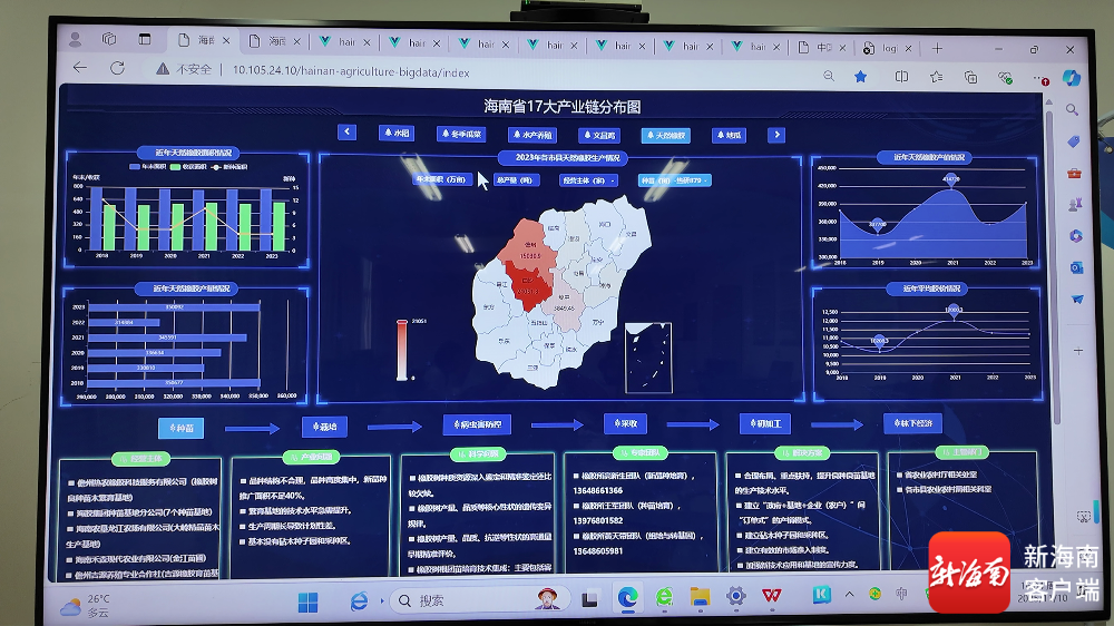 据了解,通过海南省热带特色高效农业“科技入链”一张图建设,从省级、县域、乡镇三个维度全方位展示主导产业“耕、种、收、储、加、销”各个环节产业发展现状,从宏观层面对海南省热带特色高效农业发展现状进行动态监测,实现数据统一汇聚、统一管理、集中分析和信息共享。同时通过深挖 17个农业产业全产业链信息,以“统一规划、整体设计、管理集中”为目标,解决了海南省及县域热带特色高效农业产业数据分散、数据质量不高、共享开放不足、开发利用不够等突出问题,