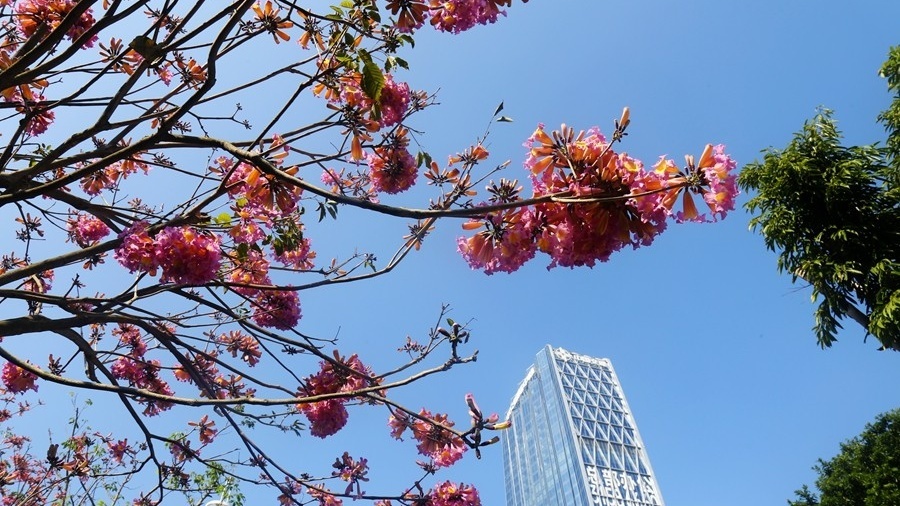拍客 | 海口国兴大道粉花风铃绽放 一簇簇柔粉缀满枝头