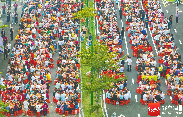 在文昌市龙楼镇铜鼓岭旅游区,“九九杯”海南(文昌)乡镇排球联赛的百桌千人村宴开席。