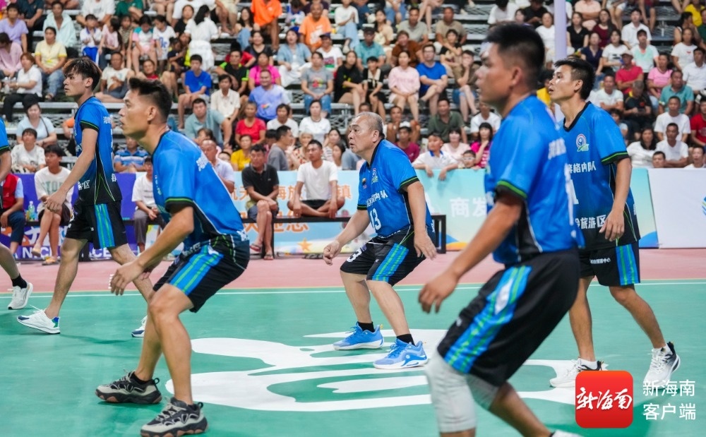 琼中湾岭镇奔格内队45岁老将陈军(右三)在比赛中。记者 李昊 摄