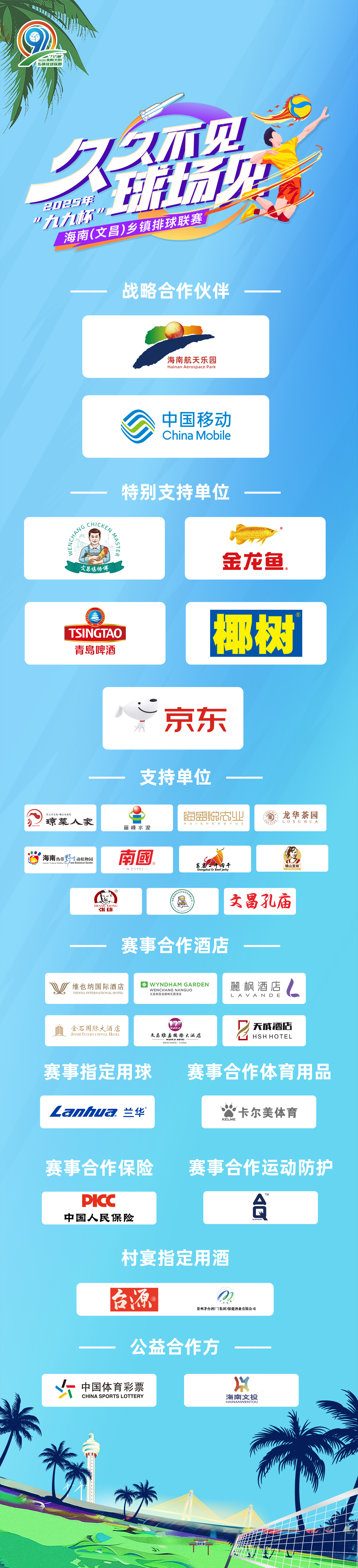 本次2025年“九九杯”海南(文昌)乡镇排球联赛由海南省旅游和文化广电体育厅、海南省农业农村厅指导,文昌市人民政府、海南日报报业集团联合主办,文昌市旅游和文化广电体育局、海南南海网传媒股份有限公司共同承办,文昌市旅游文化投资有限公司协办,海南华隆铜鼓岭旅游控股有限公司、中国移动通信集团海南有限公司战略合作支持,文昌鸡师傅劳务品牌、益海嘉里金龙鱼、青岛啤酒、椰树集团、京东特别支持。赛事指定用球由上海兰华制球有限公司提供,赛事合作保险由人保财险文昌支公司提供,赛事合作运动防护由天津领胜提供,赛事合作体育用品由卡尔美体育提供,村宴指定用酒由台源提供,公益合作方中国体育彩票、海南文投。