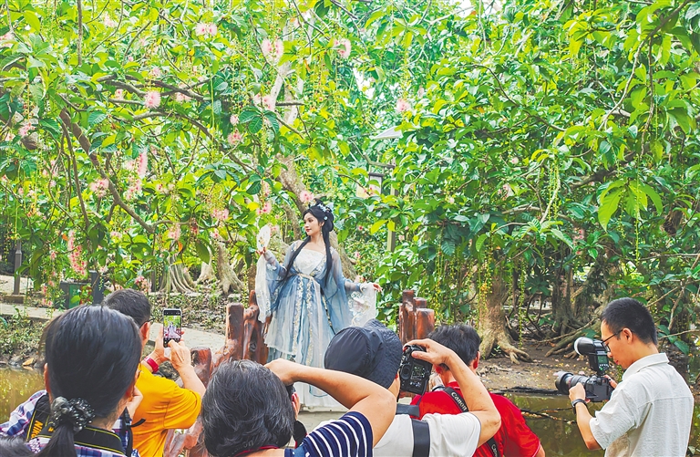 近日,儋州市中和镇七里村的玉蕊花迎来花期,繁花挂满枝头,呈现出如诗如画的美景,吸引众多摄影爱好者前来拍摄创作。