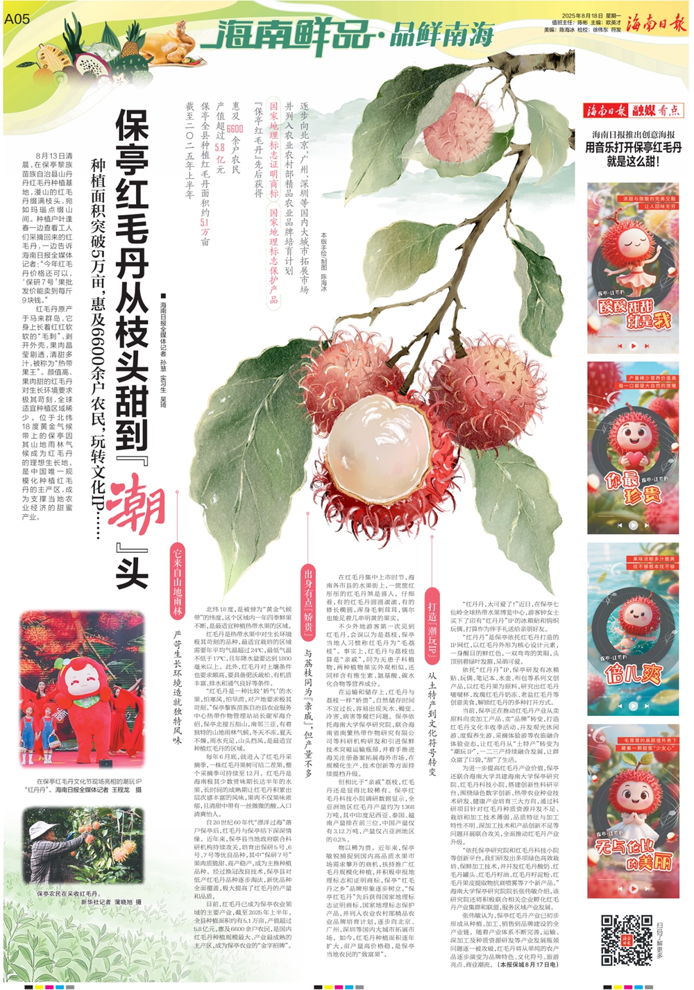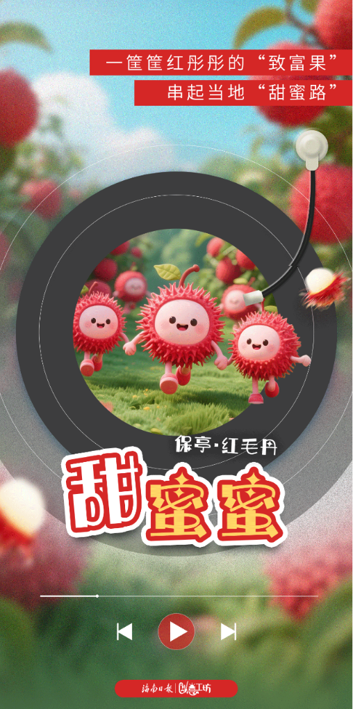 当前,保亭正在推动红毛丹产业从卖原料向卖加工产品、卖“品牌”转变,打造红毛丹文化丰收季活动、开发观光休闲游、度假养生游、采摘体验游等农旅融合体验业态,让红毛丹从“土特产”转变为“潮玩IP”,一二三产持续融合发展,让群众富了口袋,“甜”了生活。