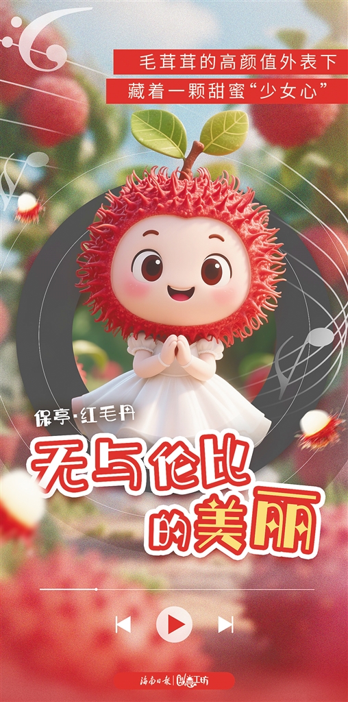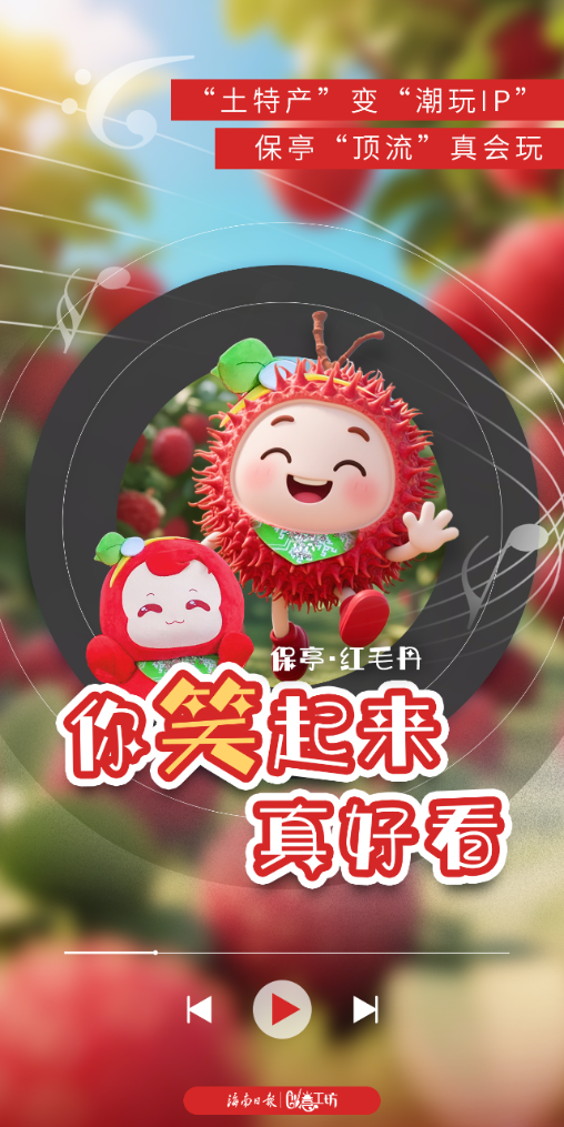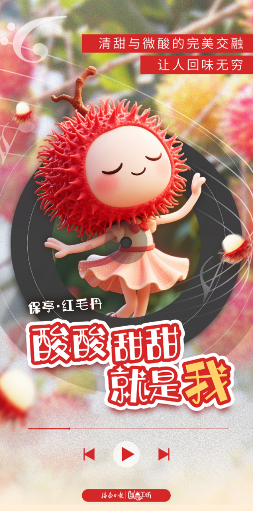 “红丹丹”是保亭依托红毛丹打造的IP网红,以红毛丹外形为核心设计元素,一身醒目的鲜红色,一双弯弯的笑眼,头顶别着绿叶发箍,呆萌可爱。