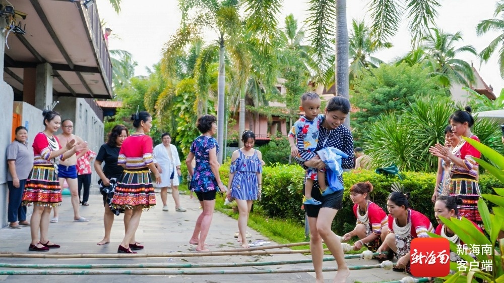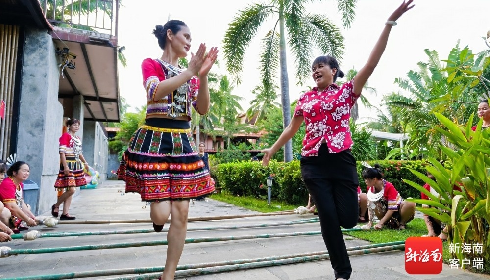 在蓝洋温泉度假村酒店,国家级非物质文化遗产黎族竹竿舞的表演成为焦点。工作人员手持竹竿整齐排列,清脆的碰击声在庭院中回荡。他们现场示范经典舞步,热情邀请市民游客加入。现场欢笑声与竹竿敲击声交织成趣,沉浸式感受黎族风情的独特魅力。现场参加竹竿舞活动的许多市民游客刚泡完温泉,他们先在氤氲温泉中卸下疲惫,随后在热闹的竹竿舞中点燃热情,感受“一静一动”的独特魅力。