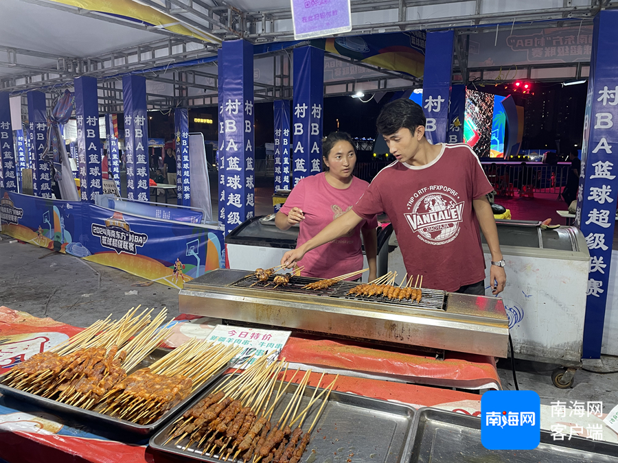 赛事期间,美食市集人潮涌动,空气中弥漫的香气时刻挑动着人们的味蕾。来自新疆的阿卜杜萨拉木连续两届“村BA”赛事都带着新疆烤串等美食扎根于市集,“我们最繁忙的一天销售额达到了1500元,准备的食材全部卖完。”