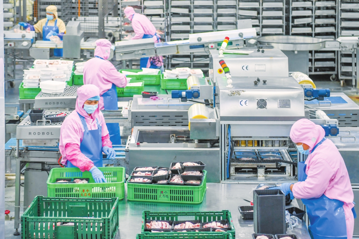 在海南(潭牛)文昌鸡股份有限公司加工车间,工作人员将鸡肉分拣包装。记者 孙士杰 摄