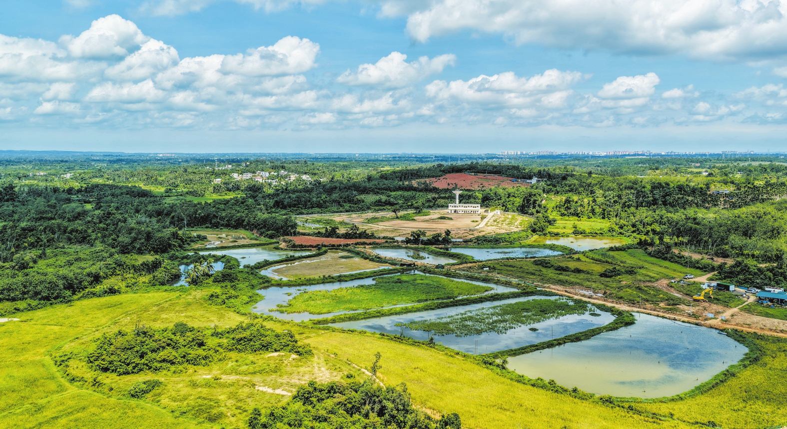 8月21日,空中俯瞰琼山区甲子镇大塘村稻虾基地,水田如镜、绿意盎然,一幅“稻虾共生”的和谐生态图景。记者 康登淋 摄