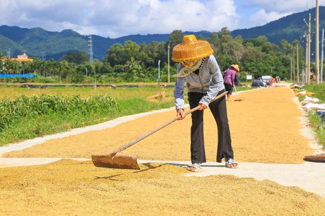 在三亚吉阳区大茅村田洋上,农民们在晾晒刚收割的稻谷。三亚传媒融媒体记者 陈聪聪 摄