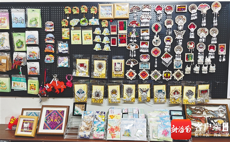 记者看到,陈碧婷的摊位上摆满各式冰箱贴、钥匙扣、香包、挂画和明信片,融入了木棉花、棋子湾、黎锦等昌江元素,其精美的造型吸引不少市民驻足问价。