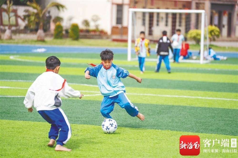 在五指山市水满中心学校体育课上,孩子们在踢足球。海南日报全媒体记者 李天平 摄
