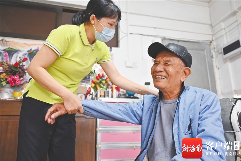 海口市琼山区文坛社区养老服务站的护理员上门为居家老人按摩。新华社记者 郭程 摄