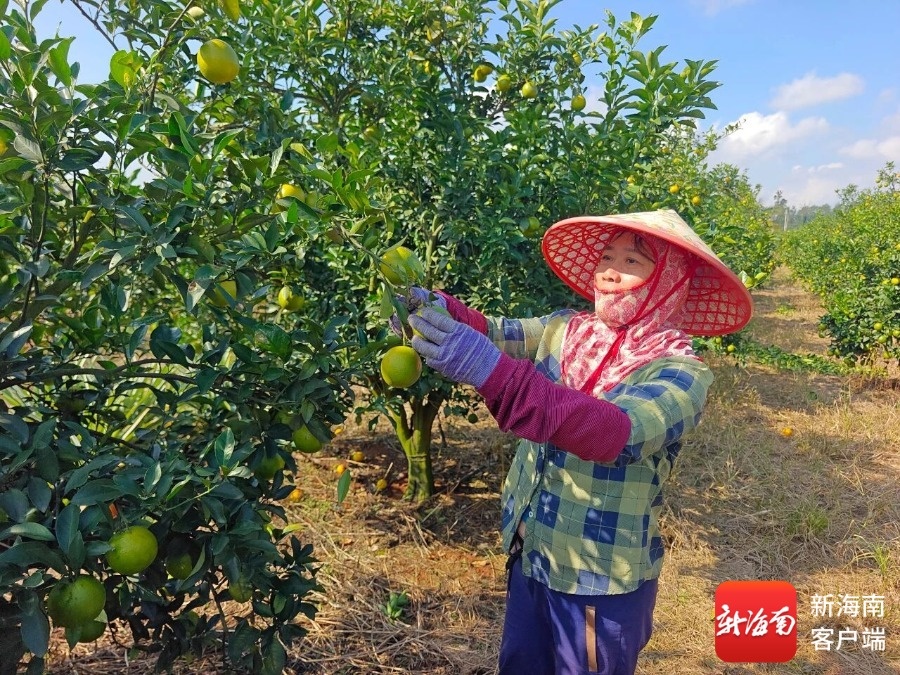 澄迈县福山镇永文村福橙种植基地工人正在采摘福橙。澄迈县融媒体中心供图