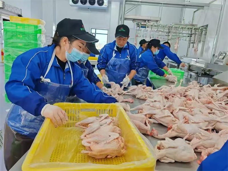 在车间内,工人们正对文昌鸡进行分装处理。