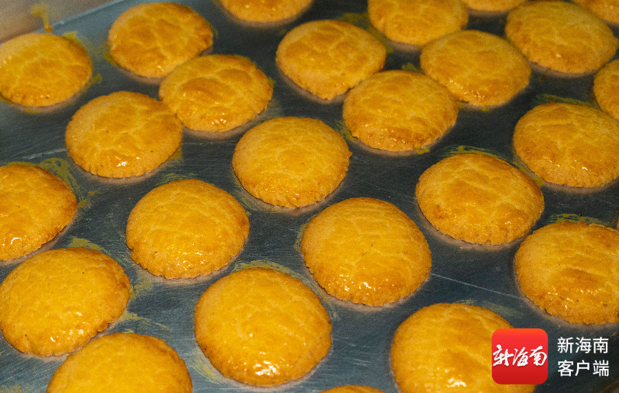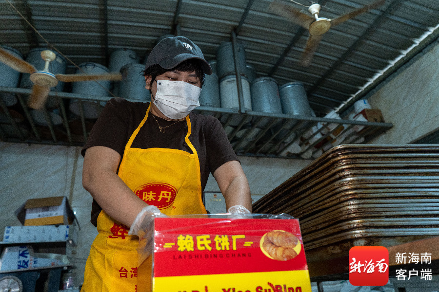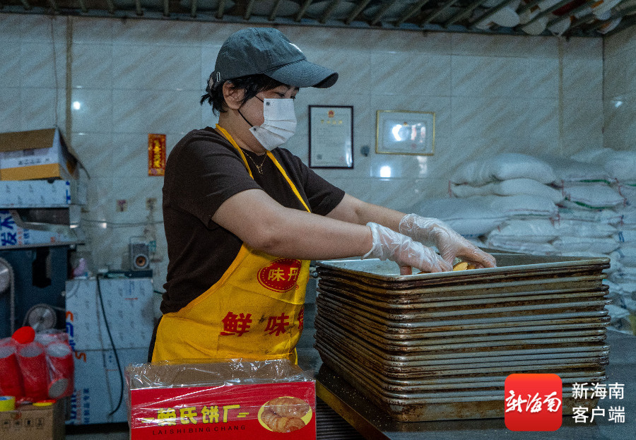 “很多街坊是吃着我们的饼长大的。”在东方市八所镇绿宝街的工坊里,赖氏饼厂负责人陈芳英站在摆满酥饼的晾架旁,一边将刚出炉的酥饼收拢进包装箱里一边说,“从孩子的满月酒,到长大后的结婚宴,各种节庆场合都少不了它,过年的时候订单太多,还会限量制作。”
