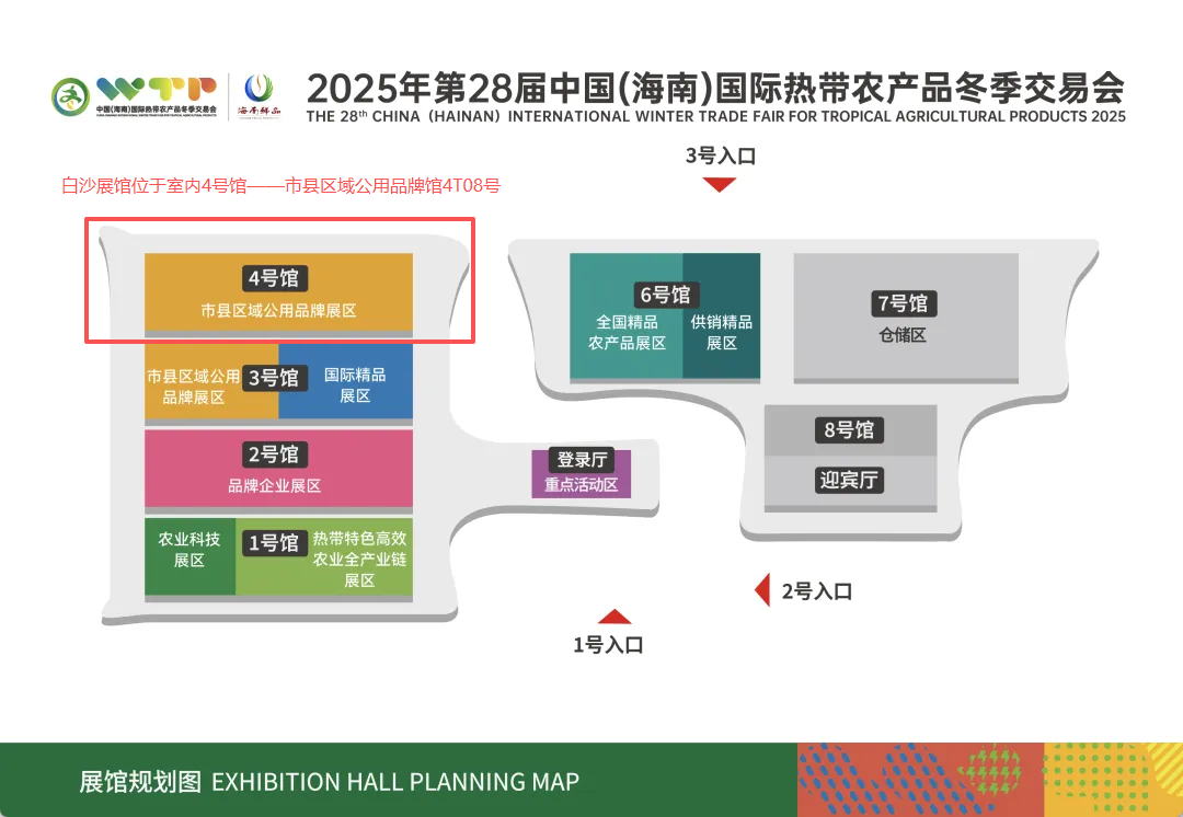 白沙展馆位于室内4号馆——市县区域公用品牌馆4T08号,展馆将雨林生态风貌与黎族文化元素深度融合,共划分兰花区、茶叶咖啡区、山兰稻非遗区、食品热带水果区、畜禽产品区、推介及电商直播区等六大展区,展现白沙“生态+民族”双重特色。