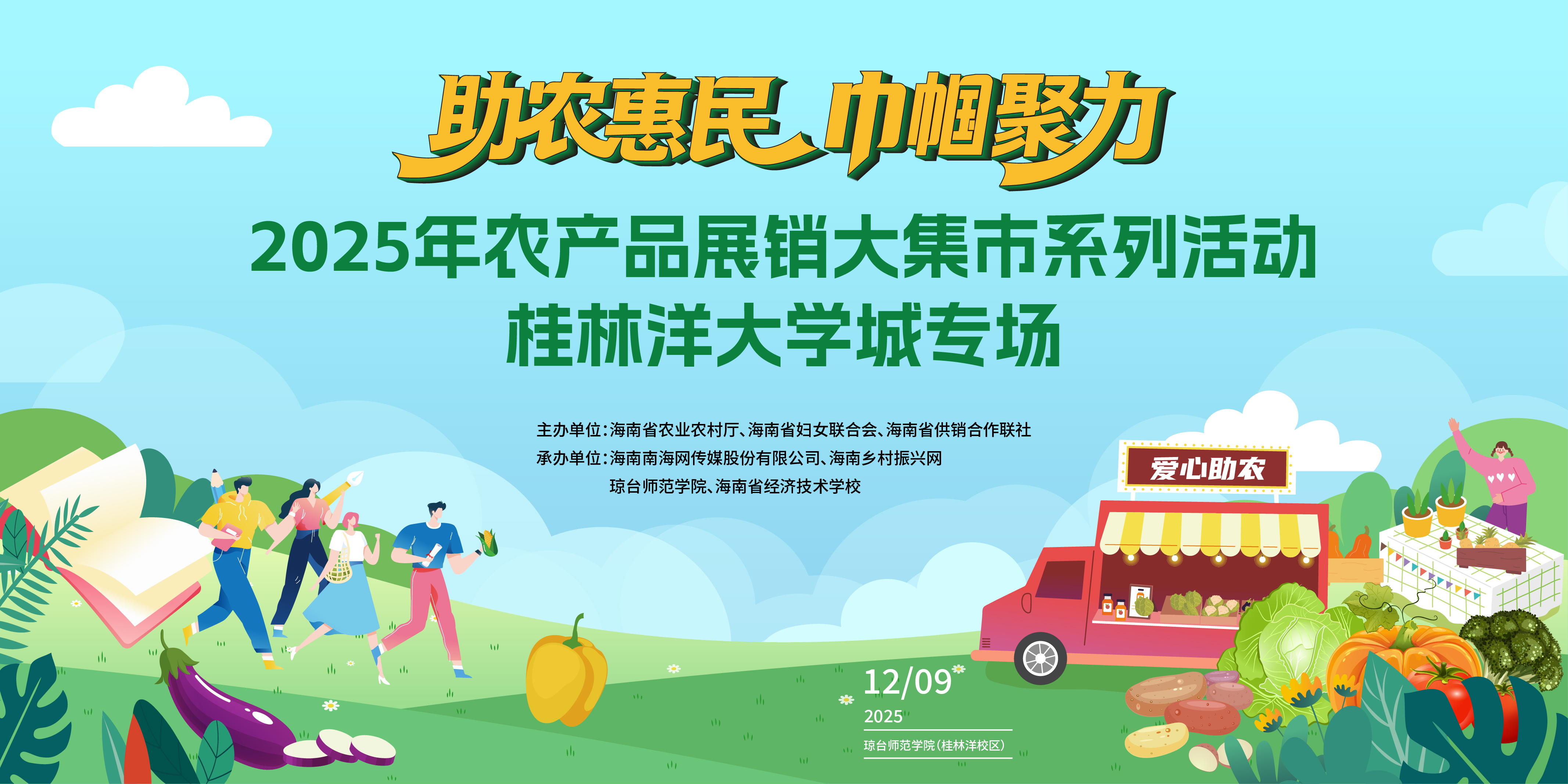 南海网、新海南客户端12月8日消息(记者 潘頔)记者从海南省农业农村厅了解到,“助农惠民 巾帼聚力”2025年农产品展销大集市系列活动桂林洋大学城专场,将于12月9日15时在琼台师范学院(桂林洋校区)图书馆北侧广场正式开市,为高校师生打造一站式农产品采购与特色体验新平台。