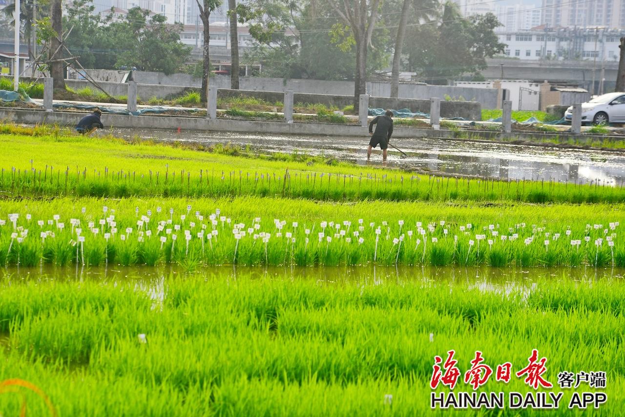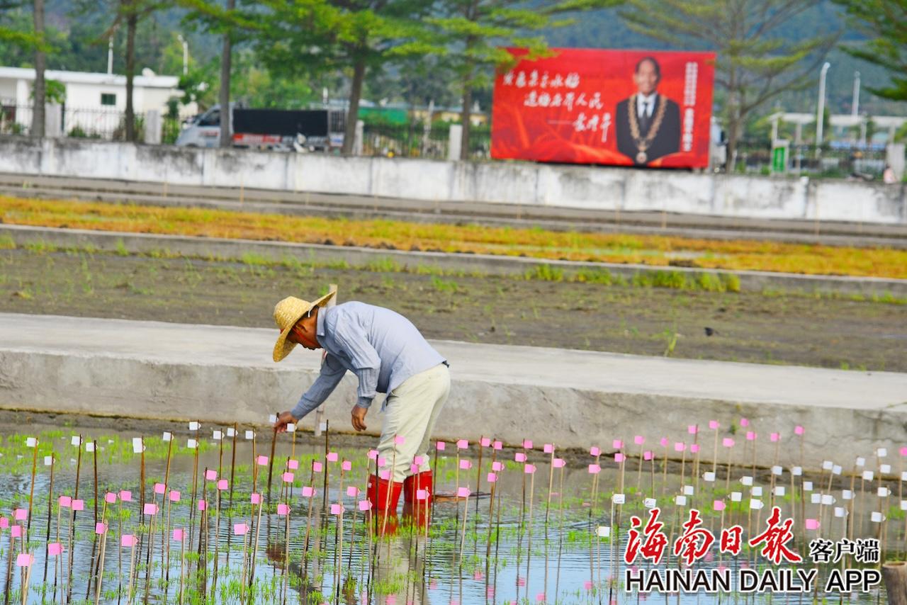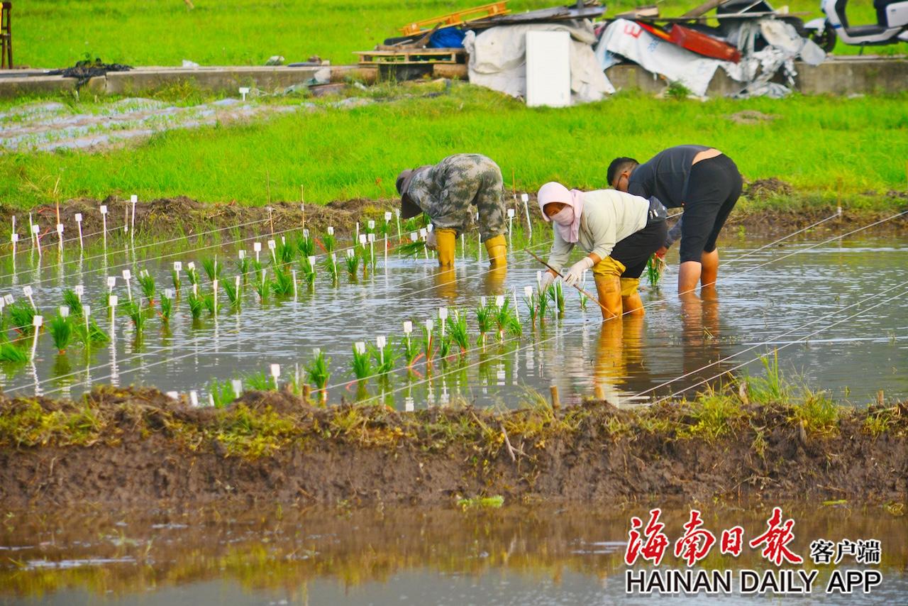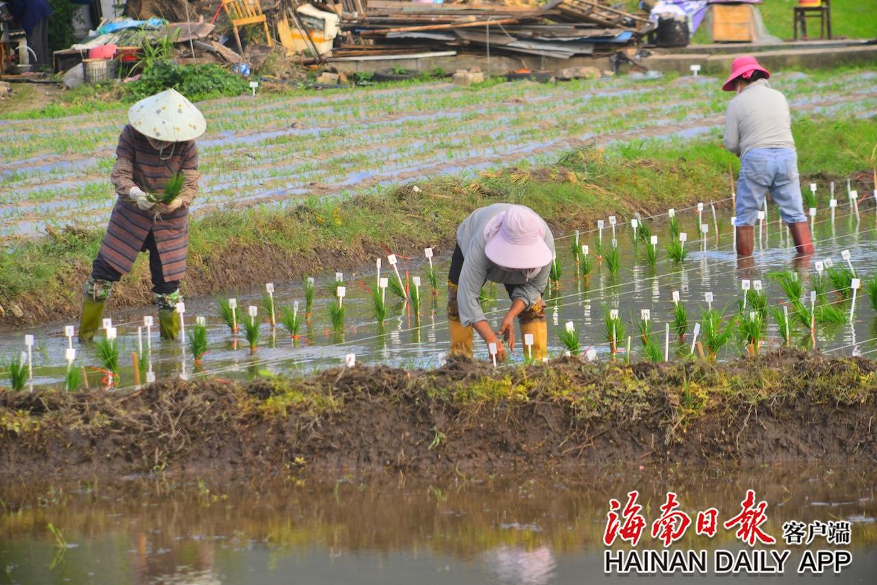 2025年12月9日,冬天的三亚市吉阳区南繁基地,南繁工作者正带领农民,在田间进行水稻种植,培育水稻优良品种。