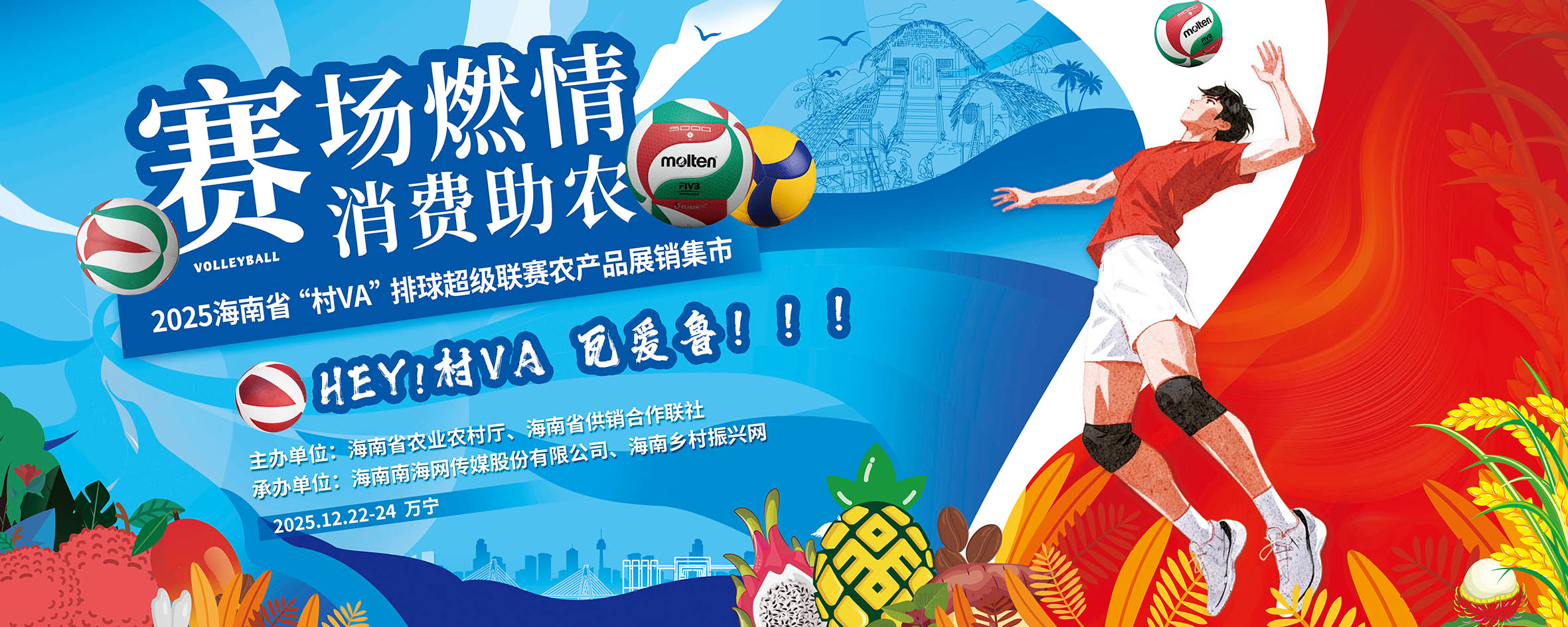 南海网、新海南客户端12月21日消息(记者易帆)记者从活动主办方获悉,2025年12月22日至24日,海南省“村VA”排球超级联赛决赛期间,将在万宁市文化体育广场同步举办“赛场燃情 消费助农”农产品展销集市活动。该活动旨在通过“体育赛事+农产品展销+非遗文化”多元融合模式,搭建助农惠农平台,助力乡村振兴。