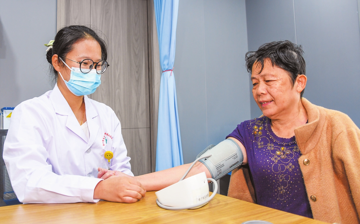在金贸街道社区卫生服务中心,医生为市民测量血压。海口日报记者 康登淋 摄