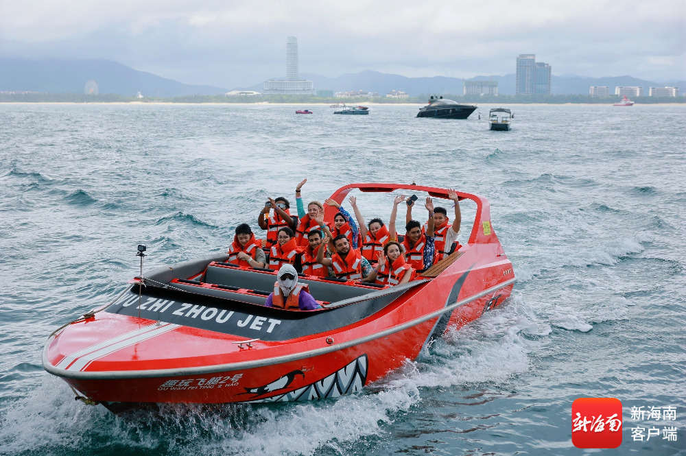 海南旅游国际推荐官在三亚蜈支洲岛旅游区体验动感飞艇。主办方供图
