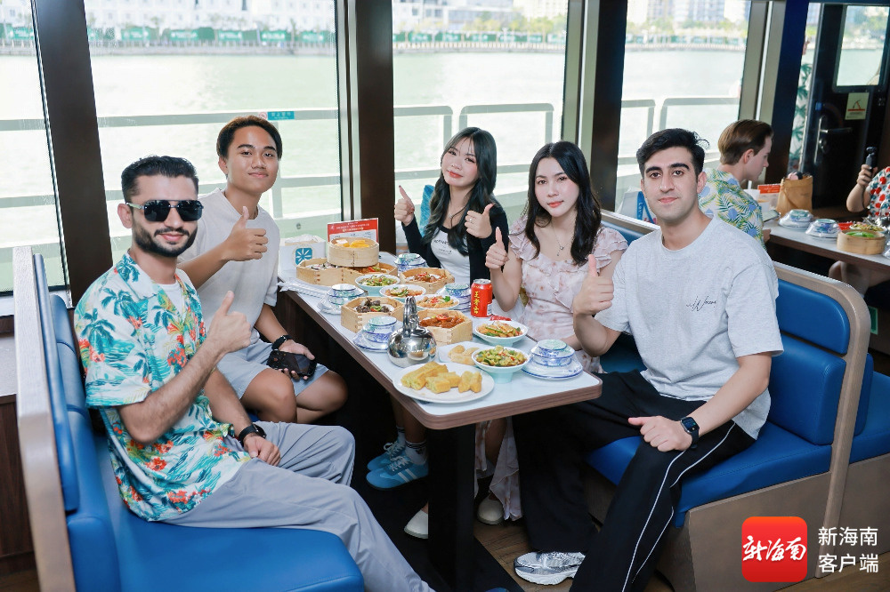 海南旅游国际推荐官在海旅游船上喝老爸茶。主办方供图