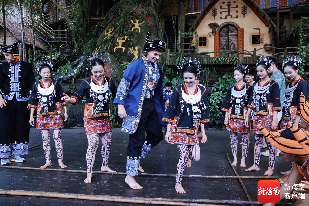 海南旅游国际推荐官在槟榔谷黎苗文化旅游区体验竹竿舞。主办方供图