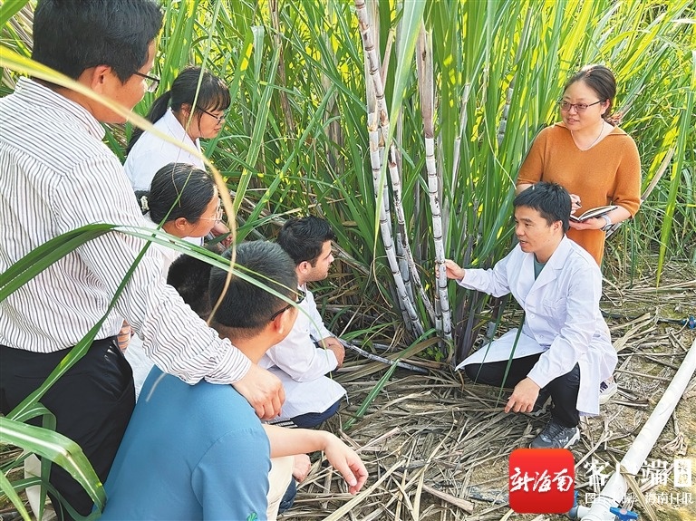 阙友雄研究员(右二)在三亚甘蔗试验基地向团队骨干和中外研究生讲解优良甘蔗品种特性。受访者供图