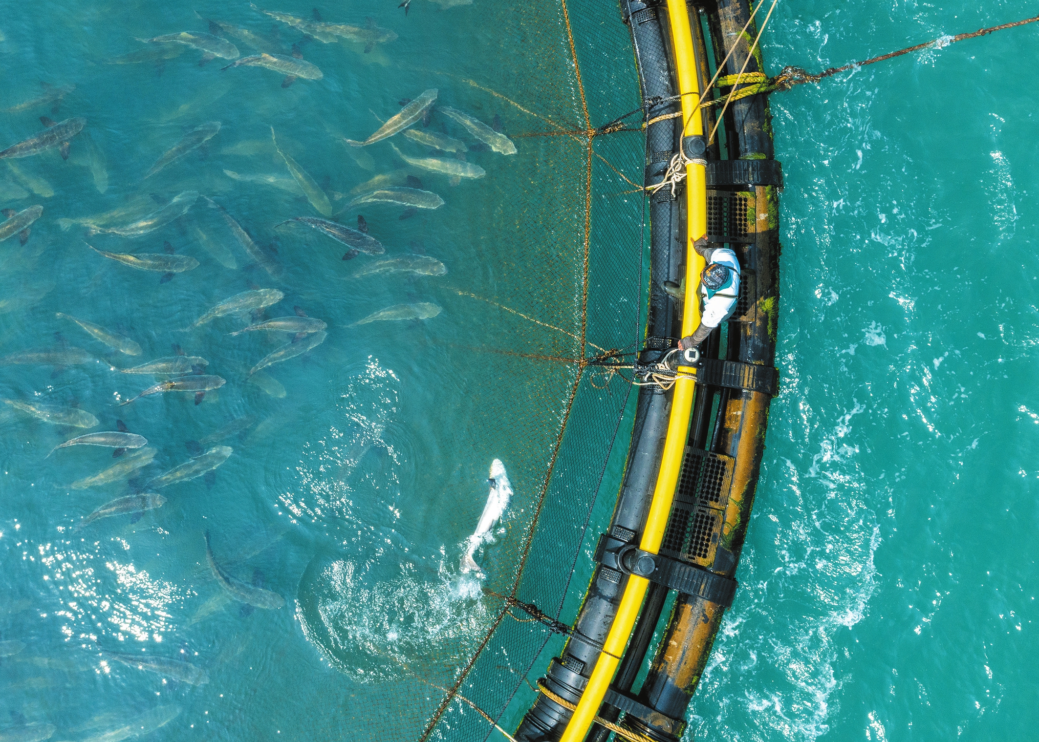 海口市秀英区荣山寮村西侧海域,蔚蓝的海面上漂浮着深水网箱,里面养殖的军曹鱼长势喜人。记者 石中华 摄