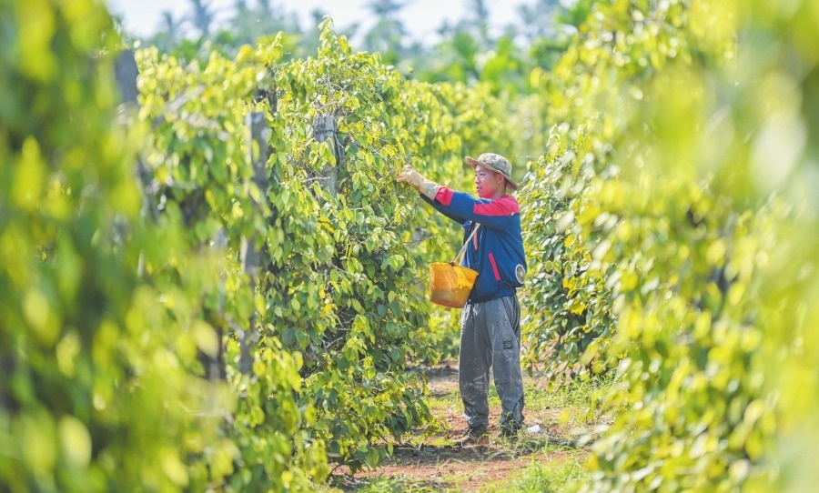 胡椒收获季,在琼山区大坡镇胡椒省级现代农业高质量发展产业园示范基地内,农户正在采收胡椒。记者 苏弼坤 摄