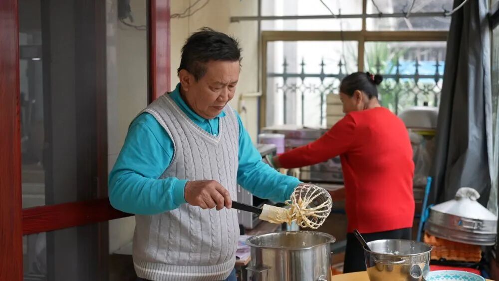 印尼归侨蔡锦美正在制作千层糕。新华社记者黎多江 摄