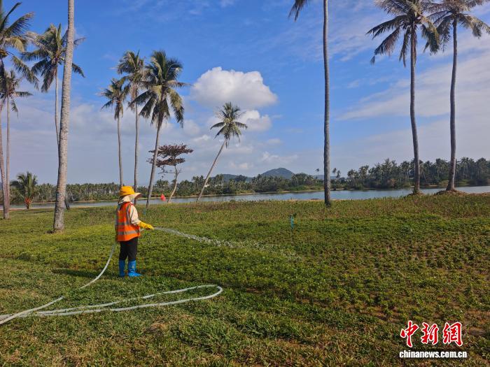 2月4日,在三亚市藤桥河流域生态修复工程项目现场,工人正对椰子洲岛上的椰林草坪进行养护作业。张月和 摄