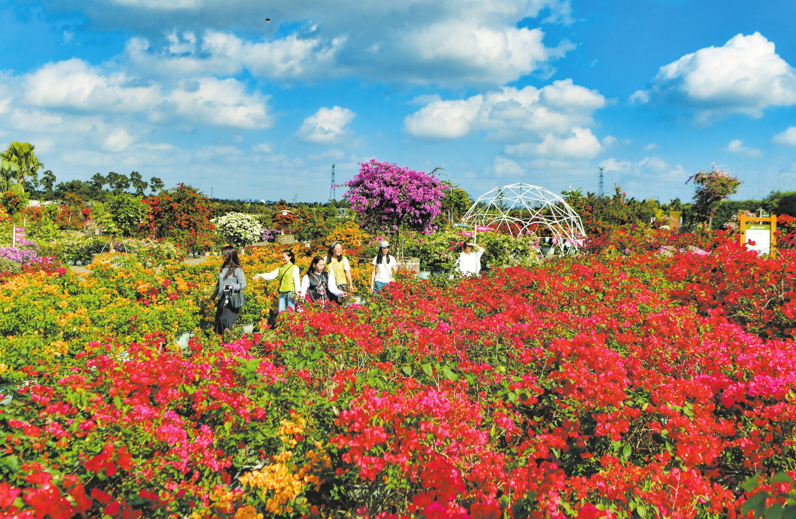 春节假期,琼山区红旗镇三角梅共享农庄各色三角梅迎风怒放,连片花海吸引不少市民游客前来赏花、游玩。(三角梅共享农庄供图)