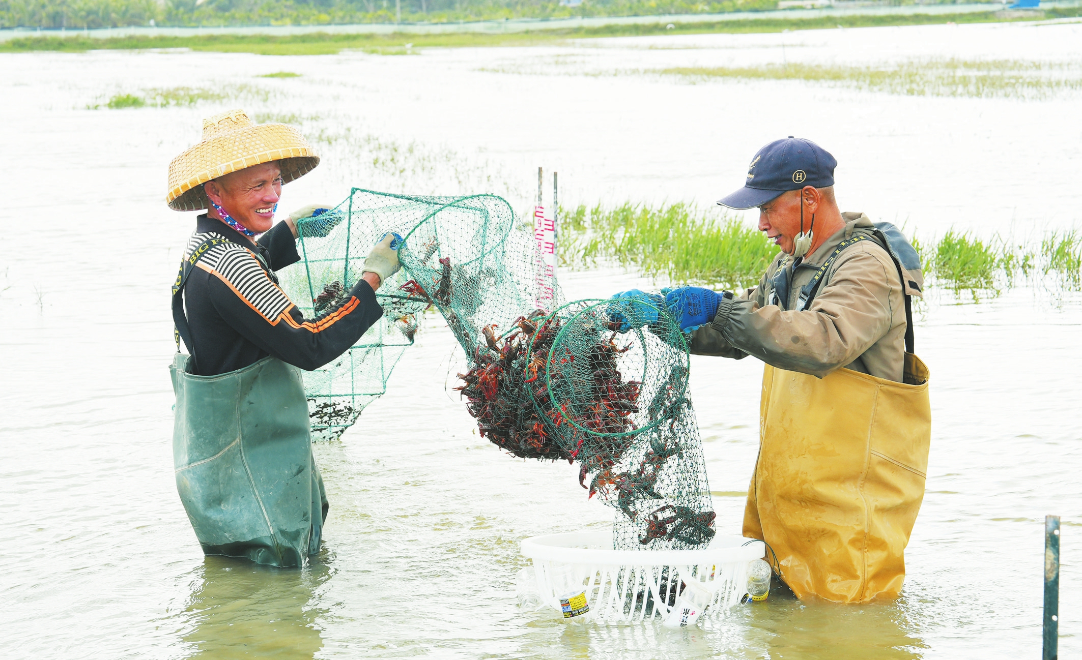 日前,美兰区三江镇的稻渔综合种养试验区一派繁忙景象。工作人员身穿齐胸防水裤在稻田里打捞小龙虾。