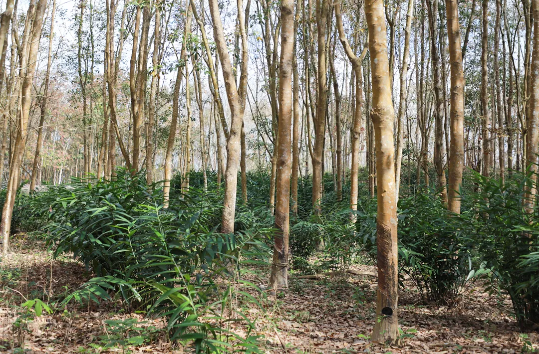 走进七坊镇照明村的橡胶林,成片的橡胶树依然郁郁葱葱。树下的南椰薯已进入收获期,叶片普遍泛黄,安静地覆盖在林间。当地推行的“橡胶宽窄行+南椰薯”复合种植模式,让这片林地实现了“一地多收”,有效提升了土地效益。
