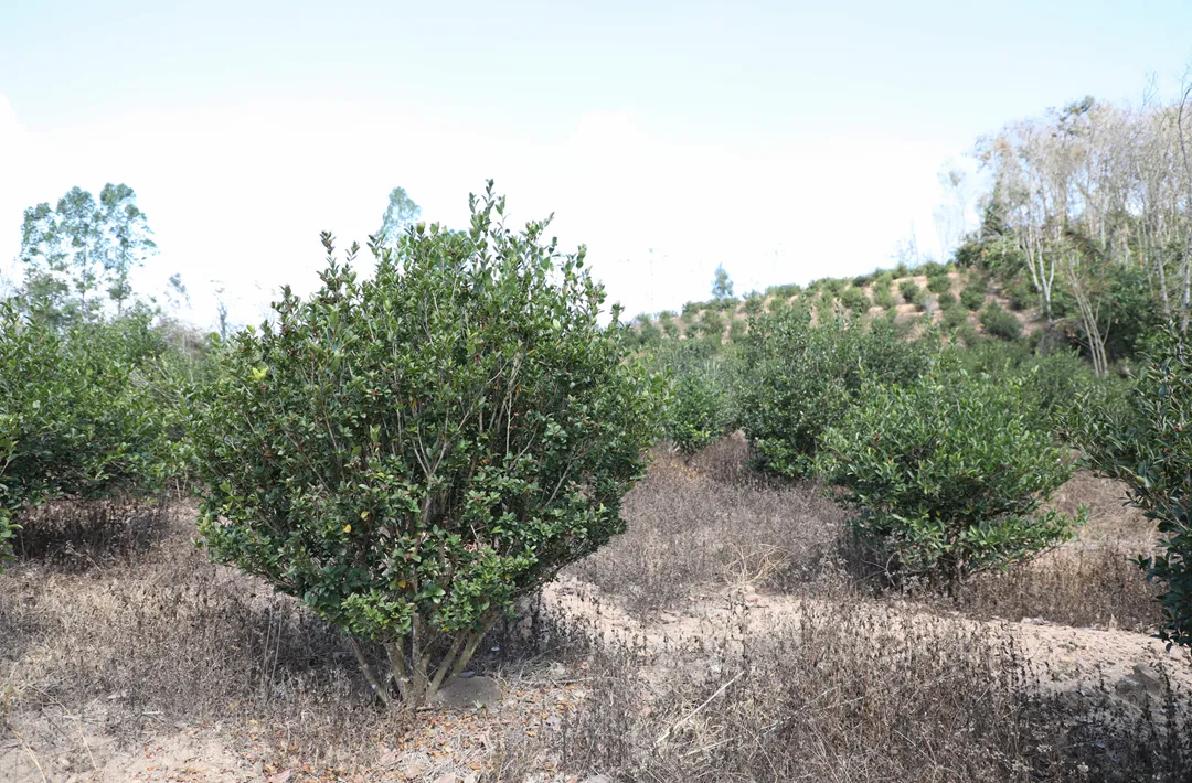 将目光转向白沙的油茶林,漫山遍野的油茶树绿意盎然,枝叶间已不见沉甸甸的果实——油茶果早已采摘归仓。茶树之下,依稀可见凋落的油茶花,静静地衬在绿意之间,整片林子显得格外宁静,只有层层叠叠的绿。