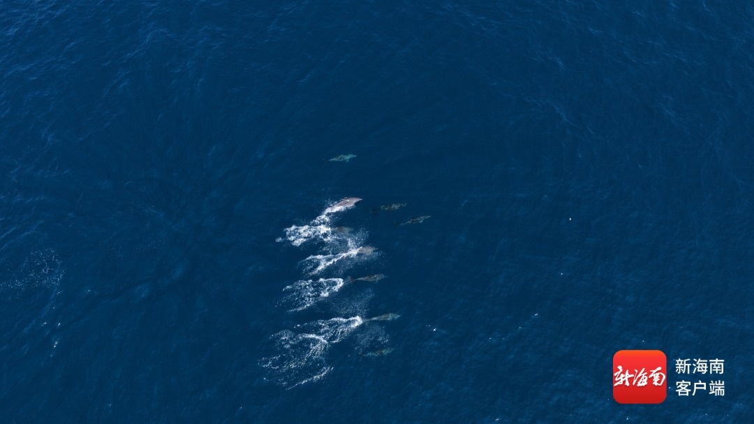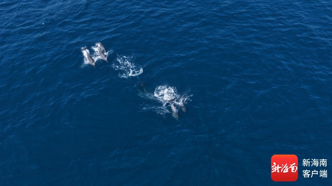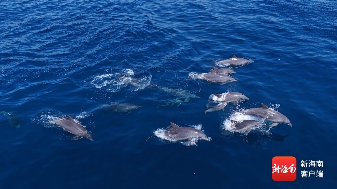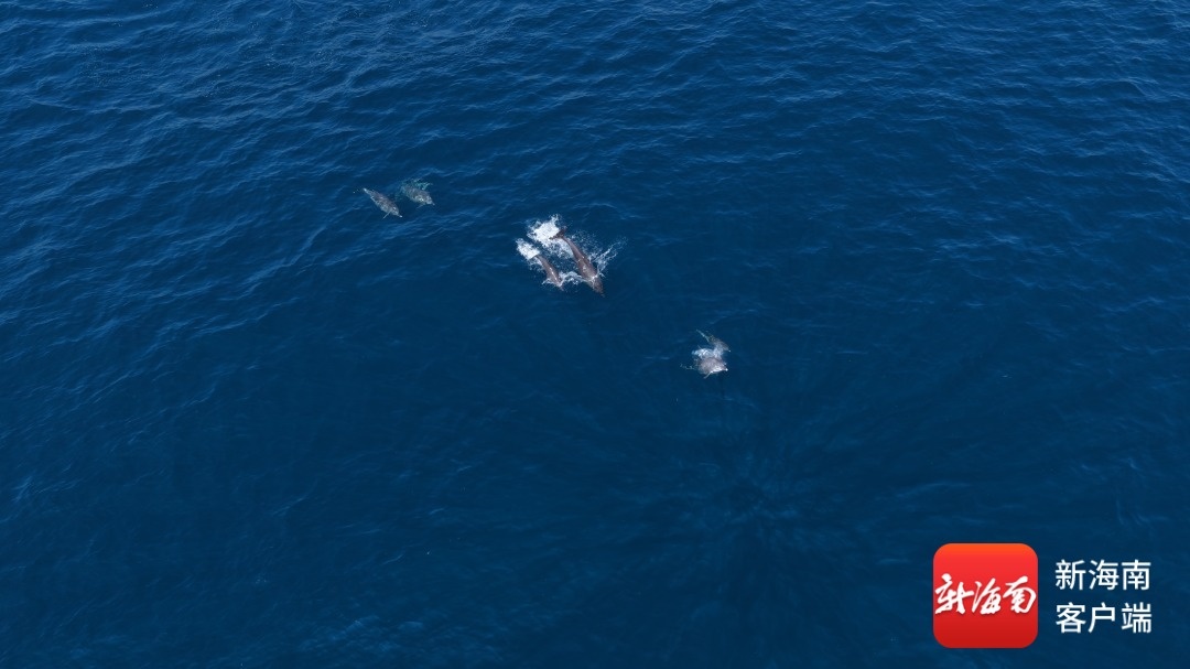 当日11时26分,景区彩虹拖伞船长谭章跃像往常一样,驾船在蜈支洲岛近海海域作业。突然,距离船身约二三十米的海面上泛起阵阵异样涟漪,“一开始我还以为是‘鱼打水’,定睛一看,好家伙——一群海豚正在船头前方‘撒欢’呢!”