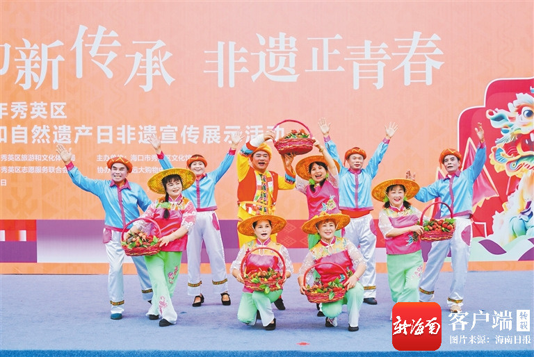 有苗村的村民背着茶筐唱小调、采茶叶;有海边的渔民织渔网、唱哩哩美;有黎寨的男人背着耕犁、牵着由人扮演的“牛”在劳作;也有村民进行舞龙、舞狮、琼剧、人偶剧、公仔戏、盅盘舞等非遗节目表演。