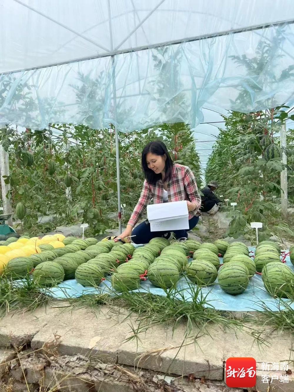 徐志红在三亚崖州南繁育种基地记录西瓜长势。