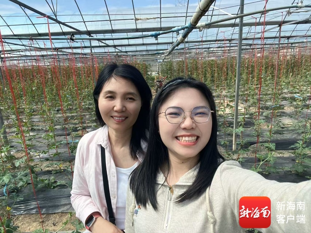 在三亚崖州南繁育种基地,徐志红(左)接受南海网、新海南客户端记者采访并合影留念。记者 凌翠云 摄