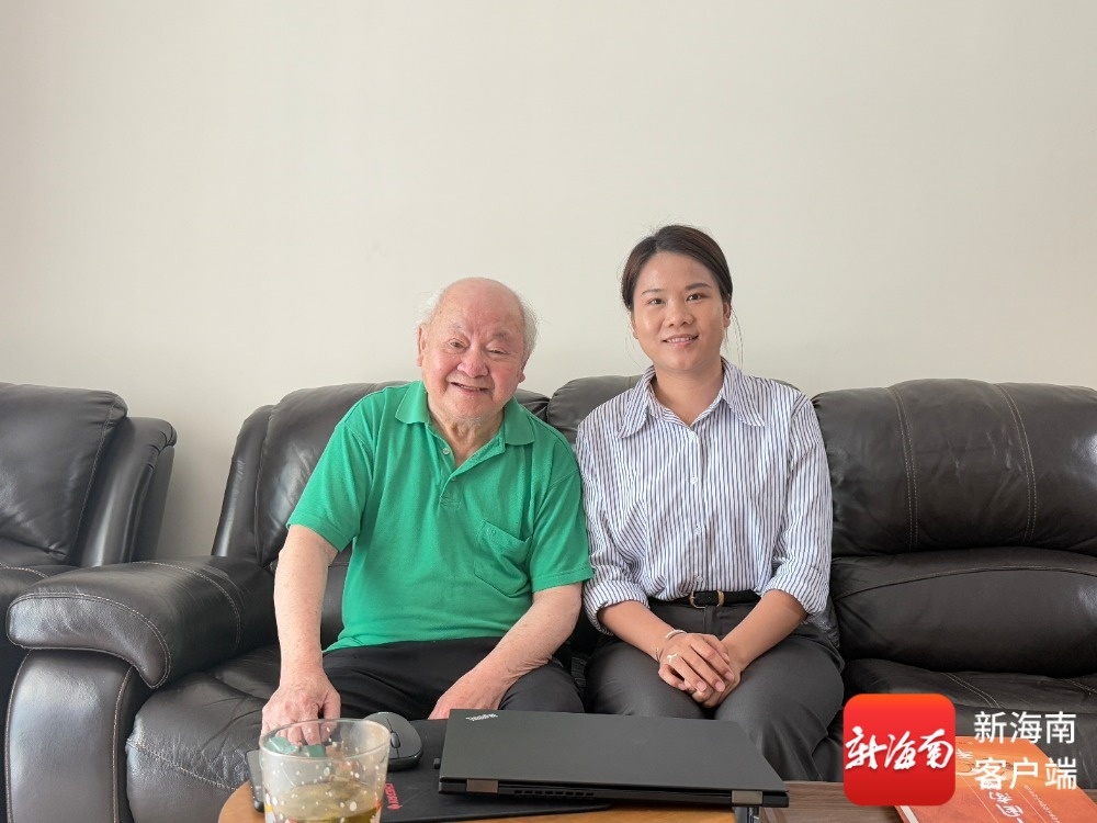 在广州老家,陈伟程(左)接受南海网、新海南客户端记者采访并合影留念。