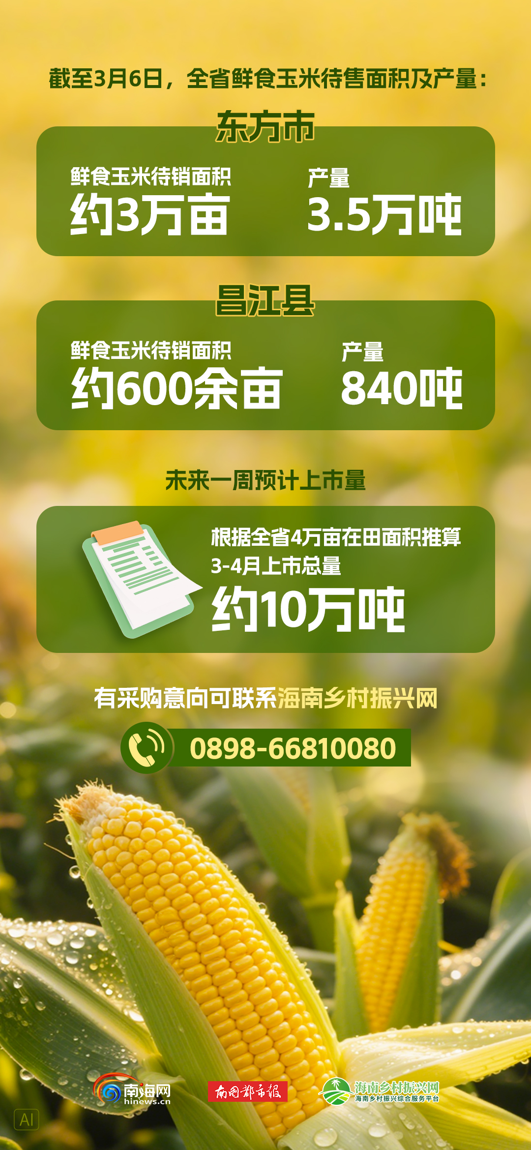 在产销对接方面,海南省供销合作联社等部门于3月5日在东方市举办了鲜食玉米订货大会,现场签约采购约200万斤。东方市同步出台运费补贴政策,在2月28日至3月15日期间收购并运输出岛的玉米,每斤可获0.05元补贴。