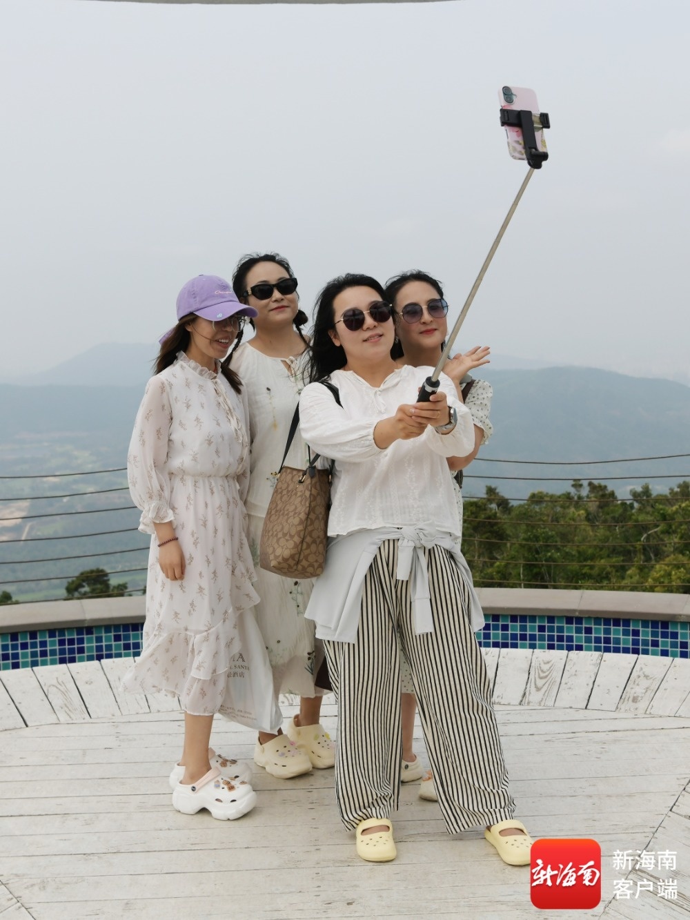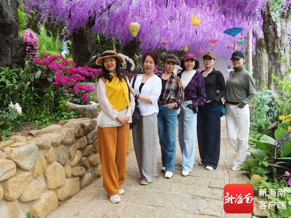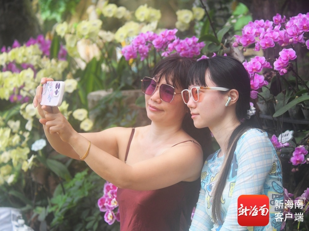 女性游客在三亚亚龙湾热带天堂森林旅游区赏花观景,拍照打卡。通讯员 黄庆优 摄