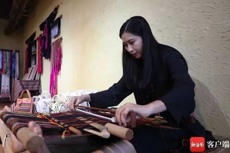 海南黎族姑娘黄映瑶正在织黎锦。