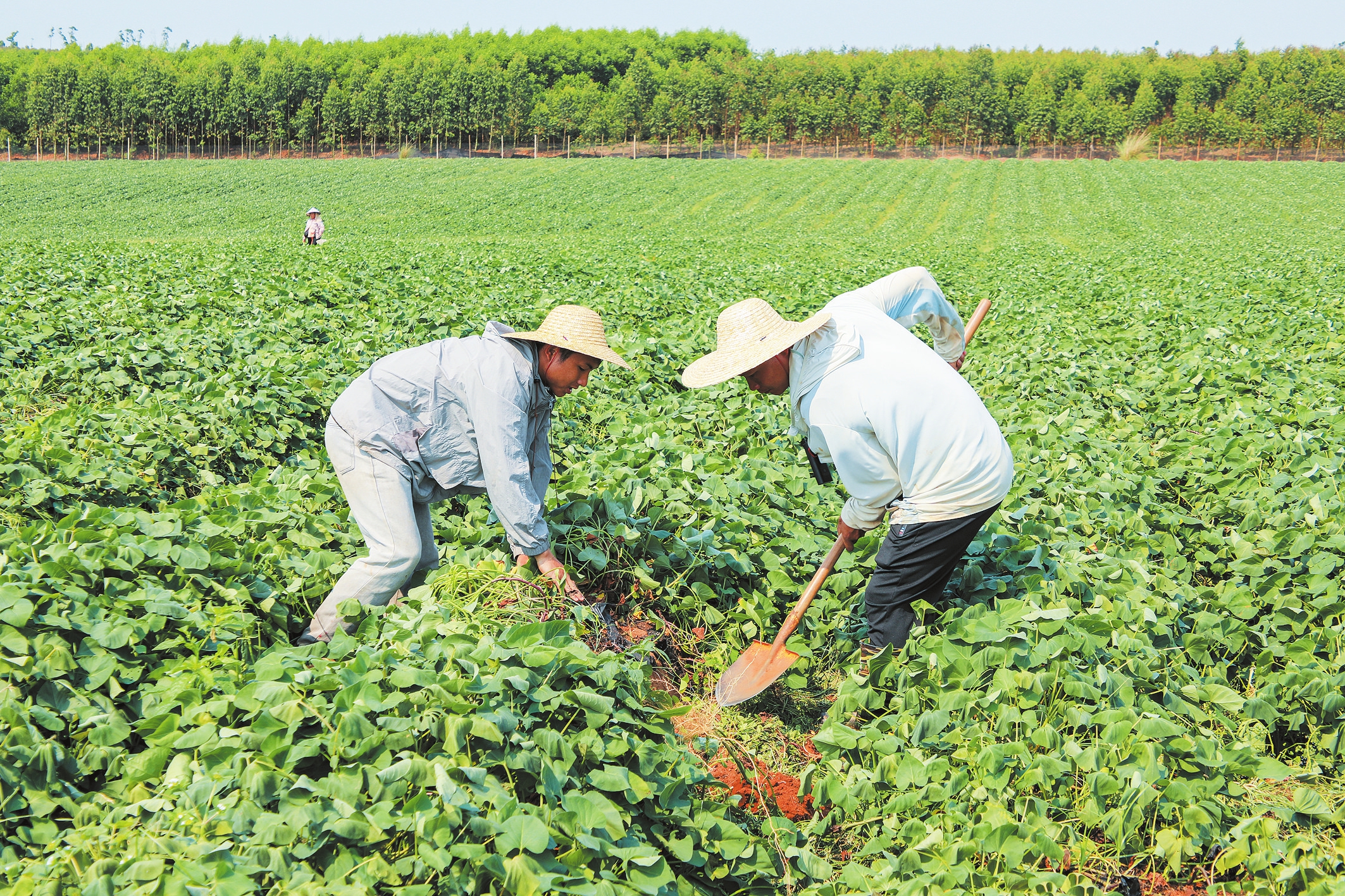 4月2日,在海口市秀英区东山镇建丰村,工作人员正在查看地瓜长势。海口日报记者 石中华 通讯员 蔡翔任 摄