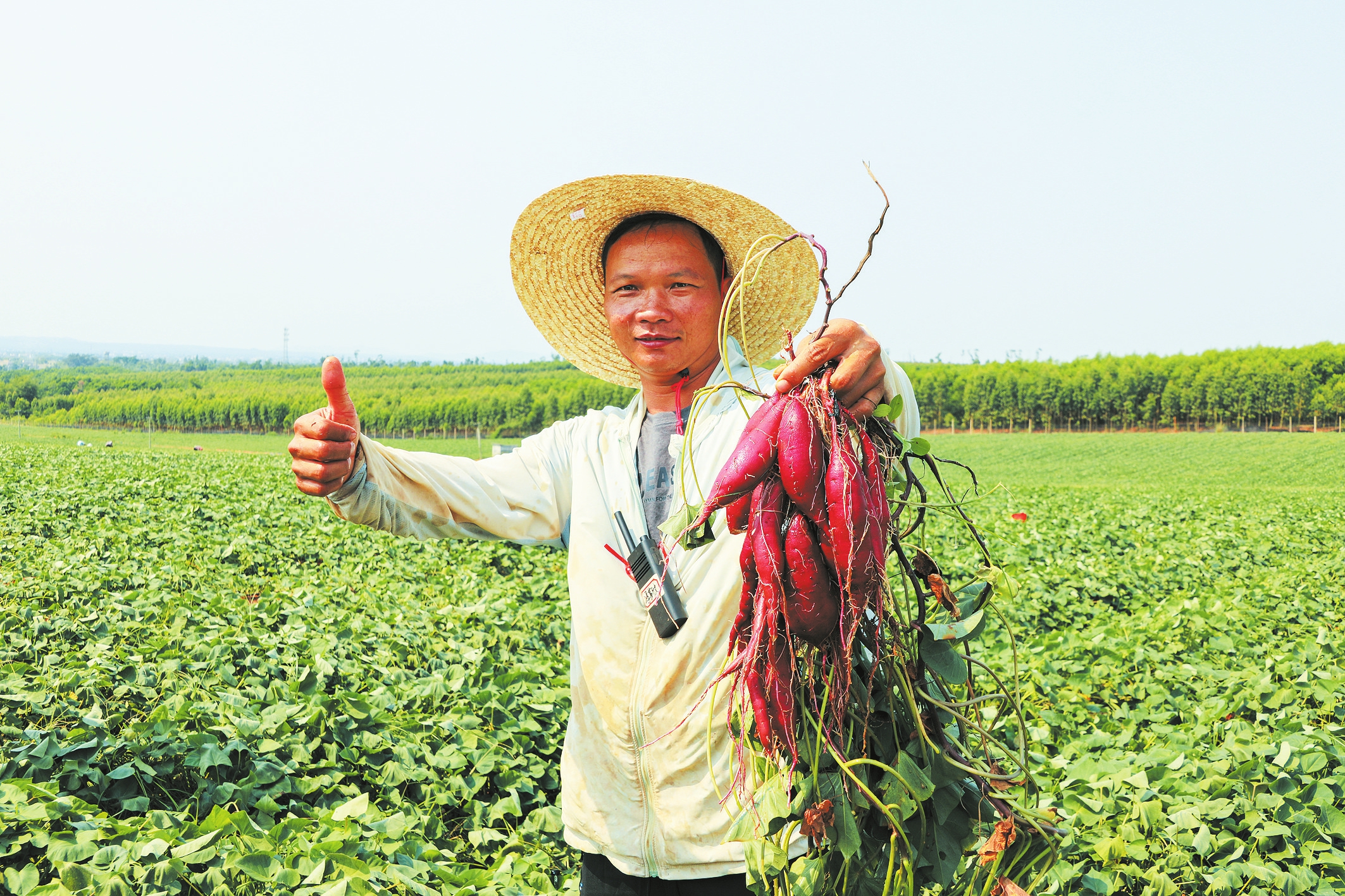 工作人员展示长势喜人的地瓜。海口日报记者 石中华 通讯员 蔡翔任 摄