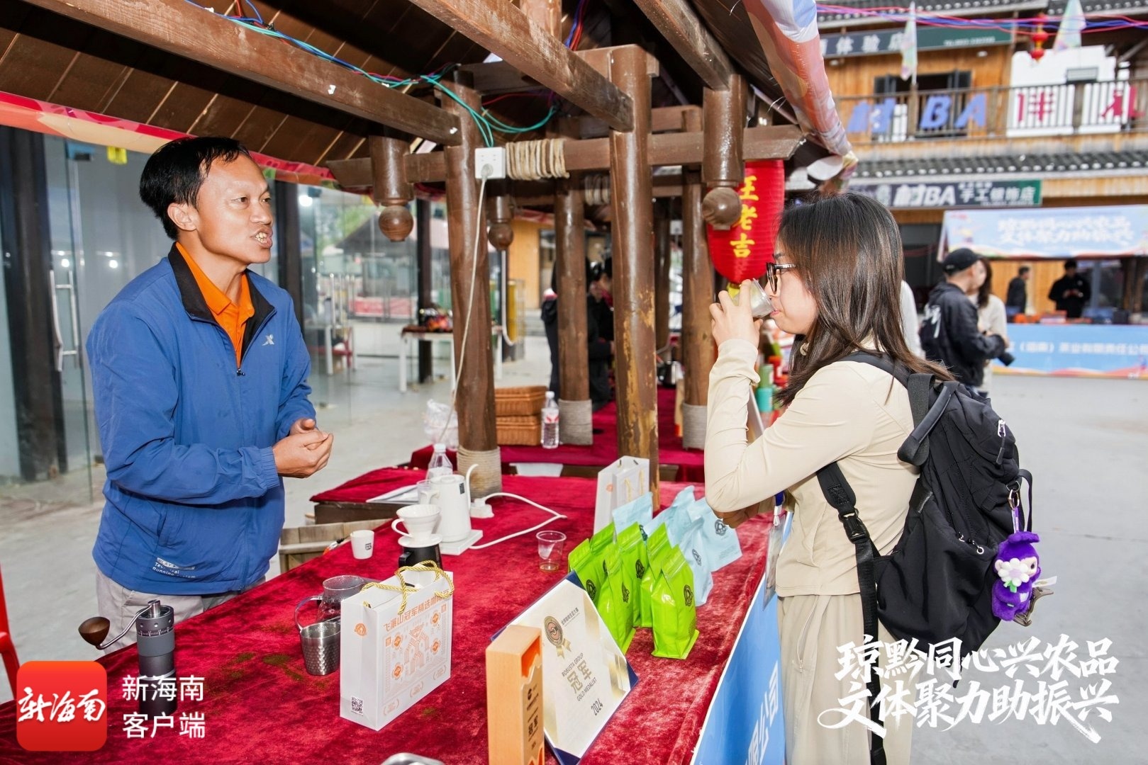 值得一提的是,在赛事期间,省农业农村厅在赛场周边同步组织以“琼黔同心兴农品 文体聚力助振兴”为主题的海南消费帮扶产品展销活动,来自海南的20余家农业企业带来热带特色农产品、非遗文创等产品,吸引大批游客驻足品尝、购买。