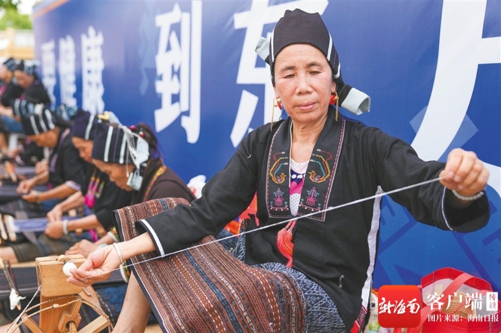 织娘在东方市大田镇三月三文化广场纺线。海南日报全媒体记者 李天平 摄