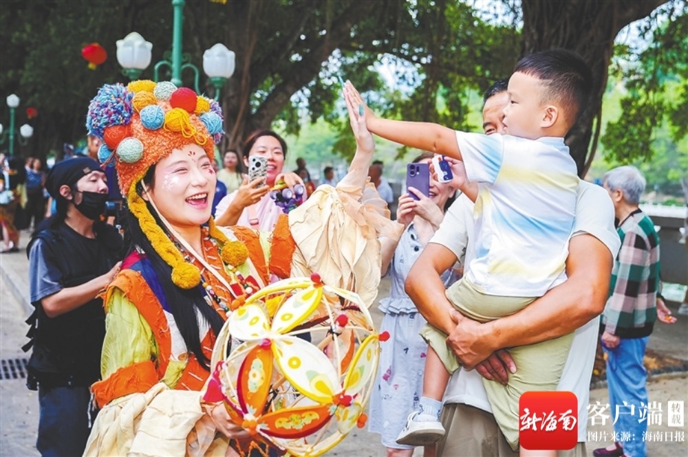 五指山华服巡游活动现场,表演者与游客互动。五指山市委宣传部供图